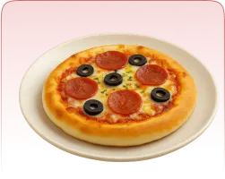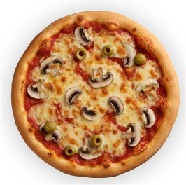 Mashrooms, green olives, black olives, marinara sauce, mozarella