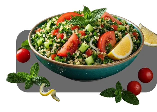 Chopped parsley, bulgure, tomatoes, mint, and lemon, olive oil dresssing