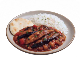 Egg plant, tomatoes, onion, garlic, spices , and olive oil, served with rice and pita bread
